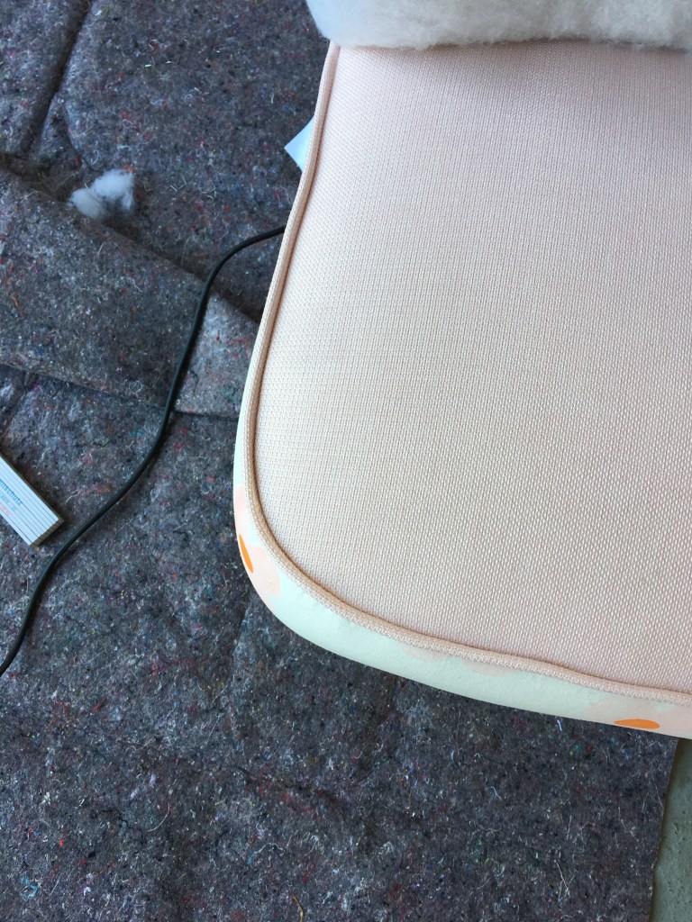 Der Stoff den ich bedruckt habe ist zum Polstern eigentlich viel zu dünn und empfindlich. Deshalb habe ich mich dafür entschieden die Sitzfläche mit einem anderen Stoff zu polstern, um den Sessel etwas unempfindlicher zu machen. Dabei habe ich mich für einen schlichten rosa Polsterstoff mit ein bisschen Struktur entschieden.