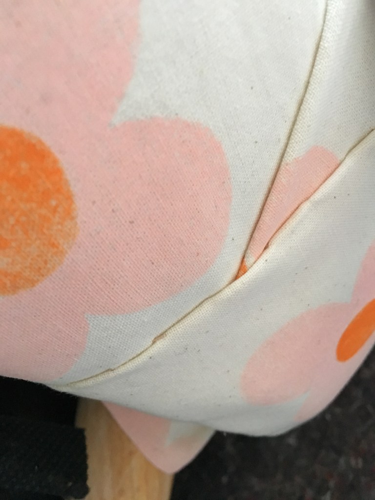 Zuerst habe ich in den rosa Stoffstreifen das Kederband eingenäht. Ein Jeder ist eine Art stabilere Paspel für Polster. Den Keder habe ich anschließend rechts auf rechts auf das vorher zugeschnittene Stoffstück für den Sitzbereich genäht. Dafür muss man direkt neben dem Keder nähen, was mit normalem Nähfüßchen gar nicht so einfach ist. Außerdem muss man darauf achten, dass die Naht weder zu fest, noch zu locker ist und darf zu Beginn und Ende die Naht nicht verriegeln.