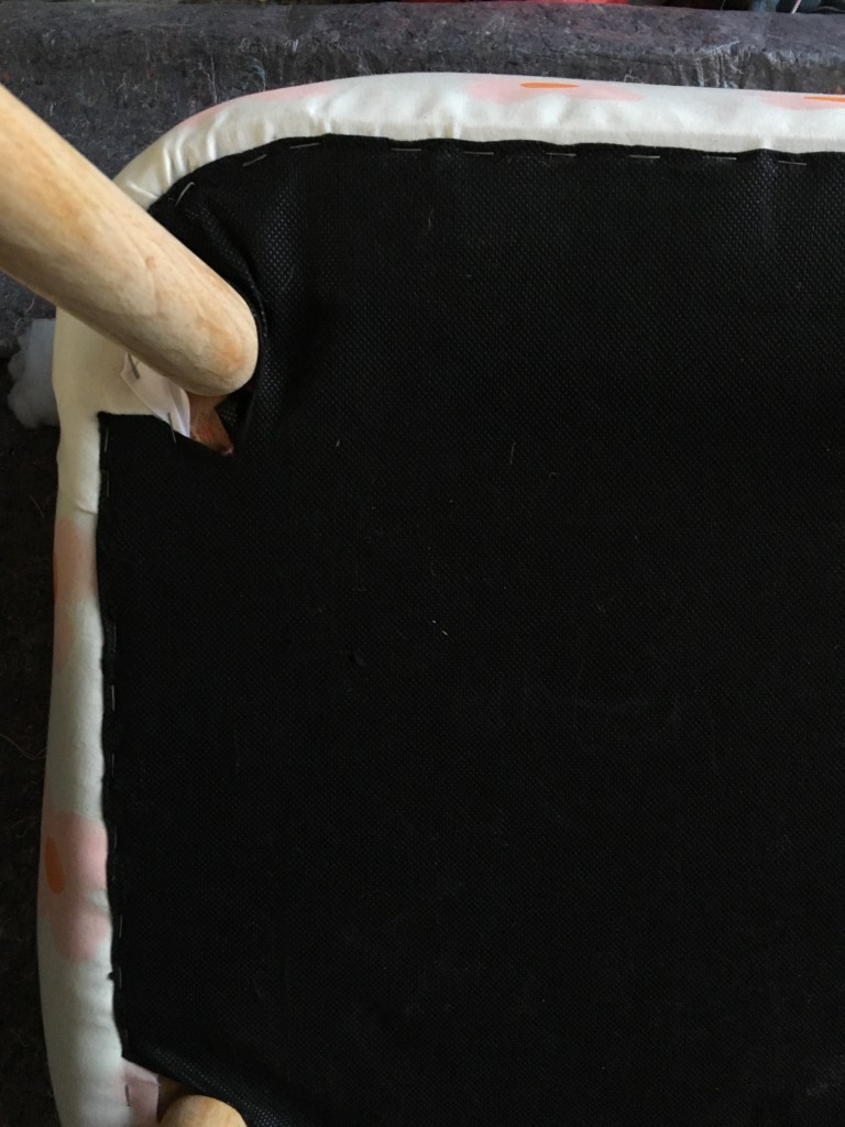 Unter diese Tackerlinie wird die Pappe angelegt und unten und oben erst einmal grob fixiert. Passt die Position wird die Pappe rundum am Holzrahmen angetackert. Der oben mit Tackernadeln fixierte Stoff wird dann umgeklappt über die Pappe gelegt, und mit Stecknadeln fixiert. Dabei dürfen keine Falten entstehen. Dann wir der Stoff unter dem Sitz festgetackert. Die Seiten werden per Hand mit einem Matratzenstich eingenäht.